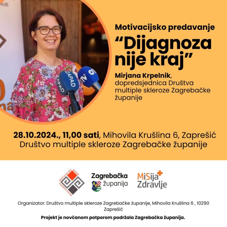 Pozivamo sve članove i one koji se tako osjećaju 🙂 na motivacijsko predavanje “Dijagnoza nije kraj” Mirjane Krpelnik, dopredsjednice Društvo multiple skleroze Zagrebačke županije. Motivacijsko predavanje će se održati 28.10.2024. s početkom u 11,00 sati u našem Društvu. MiSija Zdravlje je projekt koji se provodi s ciljem zaštite, očuvanja i unapređenja zdravlja oboljelih … Pročitaj više